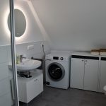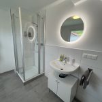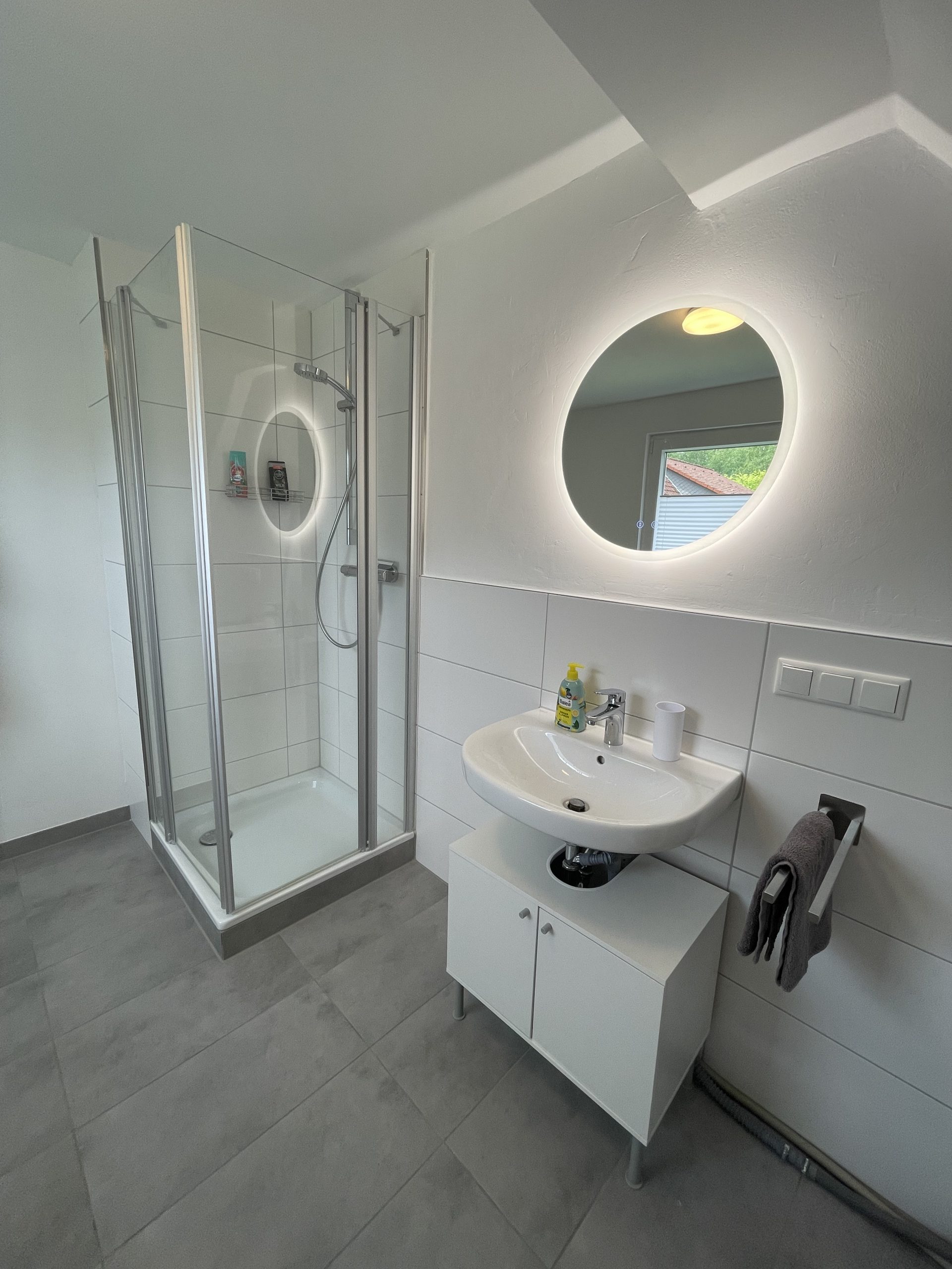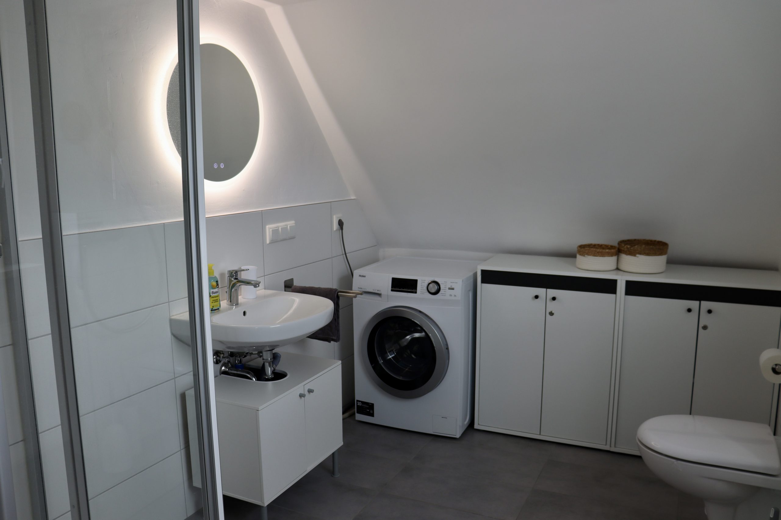 Im modern sanierten Badezimmer mit Wohlfühlfaktor findest du viel Platz, um dich frisch zu machen. Hier steht dir eine Dusche und genug Ablagefläche für die Dinge des alltäglichen Bedarfs zur Verfügung. Der Spiel über dem Waschbecken verfügt über eine angenehmes Stimmungslicht, bei dem du aus drei Lichtfarben wählen kannst. Wenn du länger bei uns bleibst, kannst du gerne auch unsere Waschmaschine nutzen und deine Wäsche im Anschluss auf dem Wäscheständer trocknen. Bitte achte nach dem Duschen und beim Wäschetrocknen auf eine ausreichende Belüftung des Badezimmers.