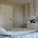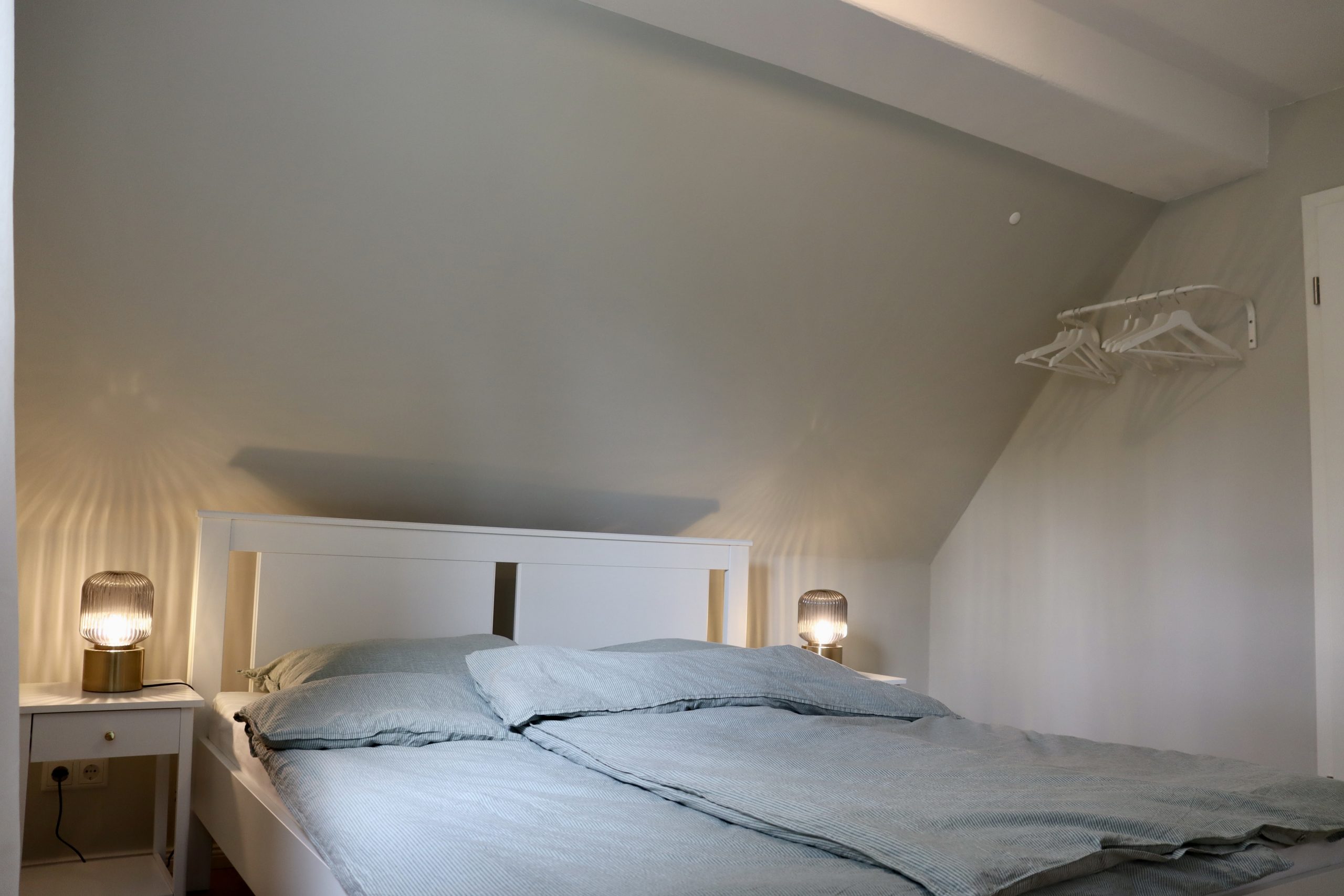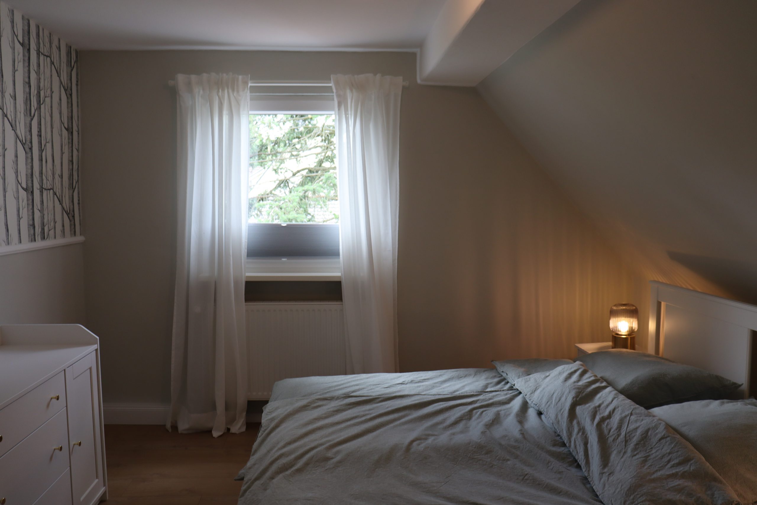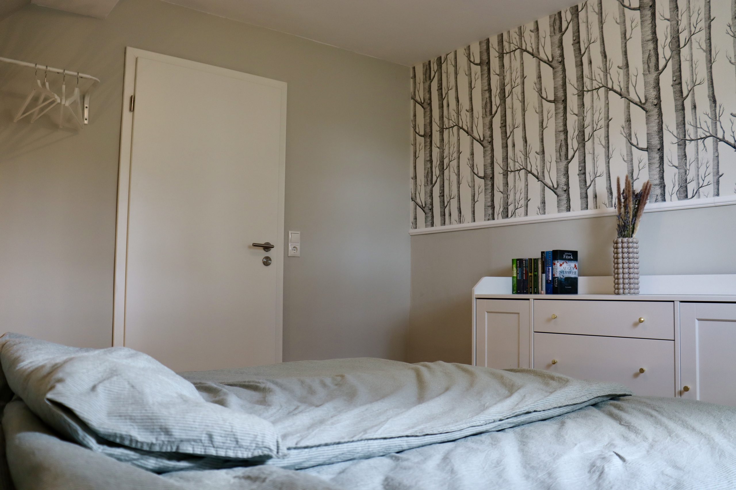 Finde Ruhe und einen erholsamen Schlaf im freundlich eingerichteten Schlafzimmer. Auf dem 160cm breiten Bett mit der hochwertigen Markenmatratze von Emma findest du alleine oder mit einer zweiten Person ausreichend Platz. In der Kommode kannst du deine Kleidung verstauen und falls du deine Sachen lieber aufhängen möchtest, kannst du das auf der Kleiderstange an der Wand mit den Kleiderbügeln gerne machen. Mit Blick auf die Designtapete mit dem Motiv eines Birkenwalds kannst du die Eindrücke aus der Natur noch einmal Revue passieren lassen. Oder du lässt das Licht der Nachttischlampe brennen und nimmst dir die Zeit, ein paar Seiten aus einem Buch zu lesen. Du hast vergessen, Bücher einzupacken? Kein Problem: Hier steht eine Auswahl an Romanen für dich bereit. Gerne stellen wir dir für deinen Aufenthalt auch ein Bettwäsche-Set zur Verfügung. Mehr dazu erfährst du unter Preise & Buchung.