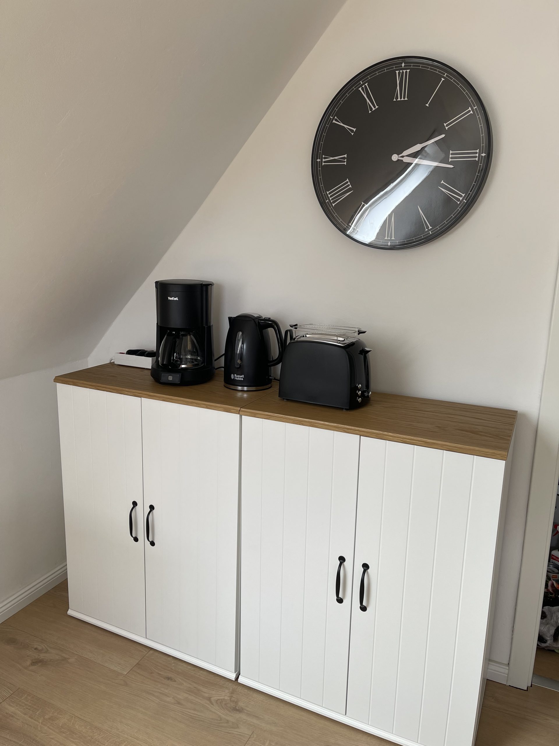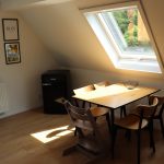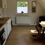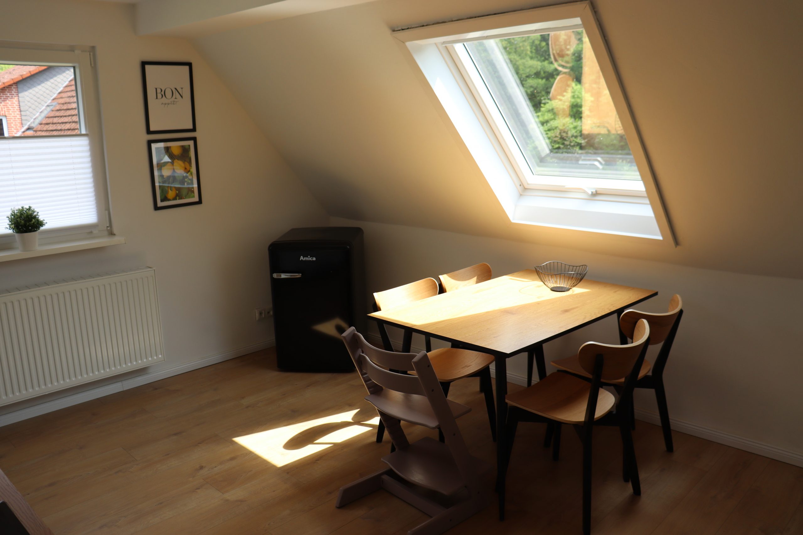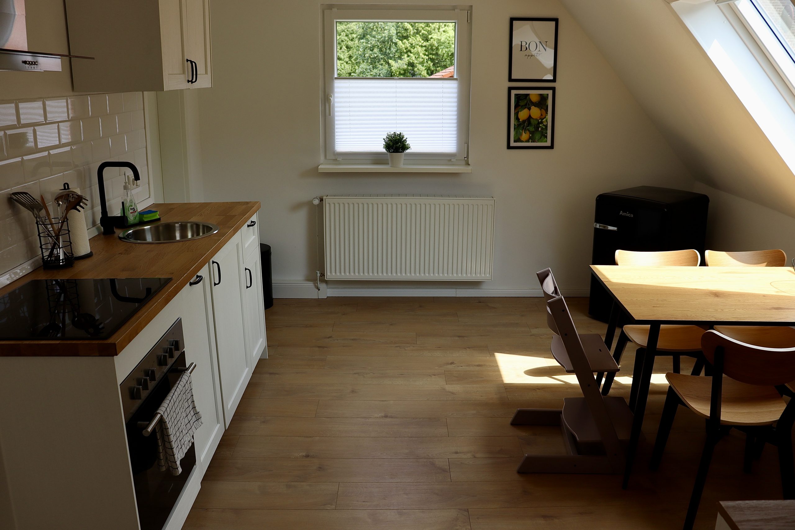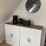 Die Küche ist voll ausgestattet mit Küchengeräten, wie Herd, Backofen, Wasserkocher, Toaster und Kaffeemaschine, sowie Geschirr, Besteck, Töpfen und weiterem Zubehör. Auch eine Geschirrspülmaschine ist in der Küchenzeile eingebaut, die dir den lästigen Abwasch abnimmt. Verbrauchsmaterial, wie Zucker, Salz, Pfeffer und Kaffeefilter, stehen hier ebenfalls kostenfrei zur Verfügung. Der Kühlschrank bietet ausreichend Platz für 2 Personen, um sich selbst zu versorgen. Am modernen Esstisch finden bis zu 4 Personen Platz. Der Tripp Trapp steht unseren kleinen Gästen zur Verfügung, sodass sie am Tisch auch bequem Platz nehmen können.