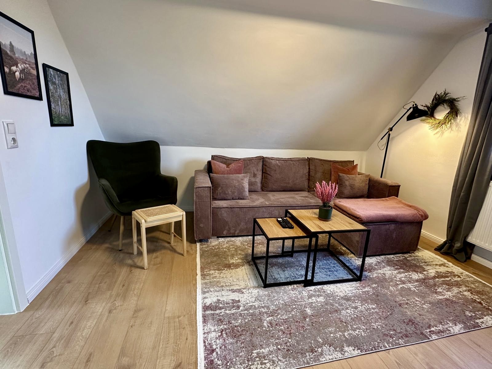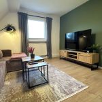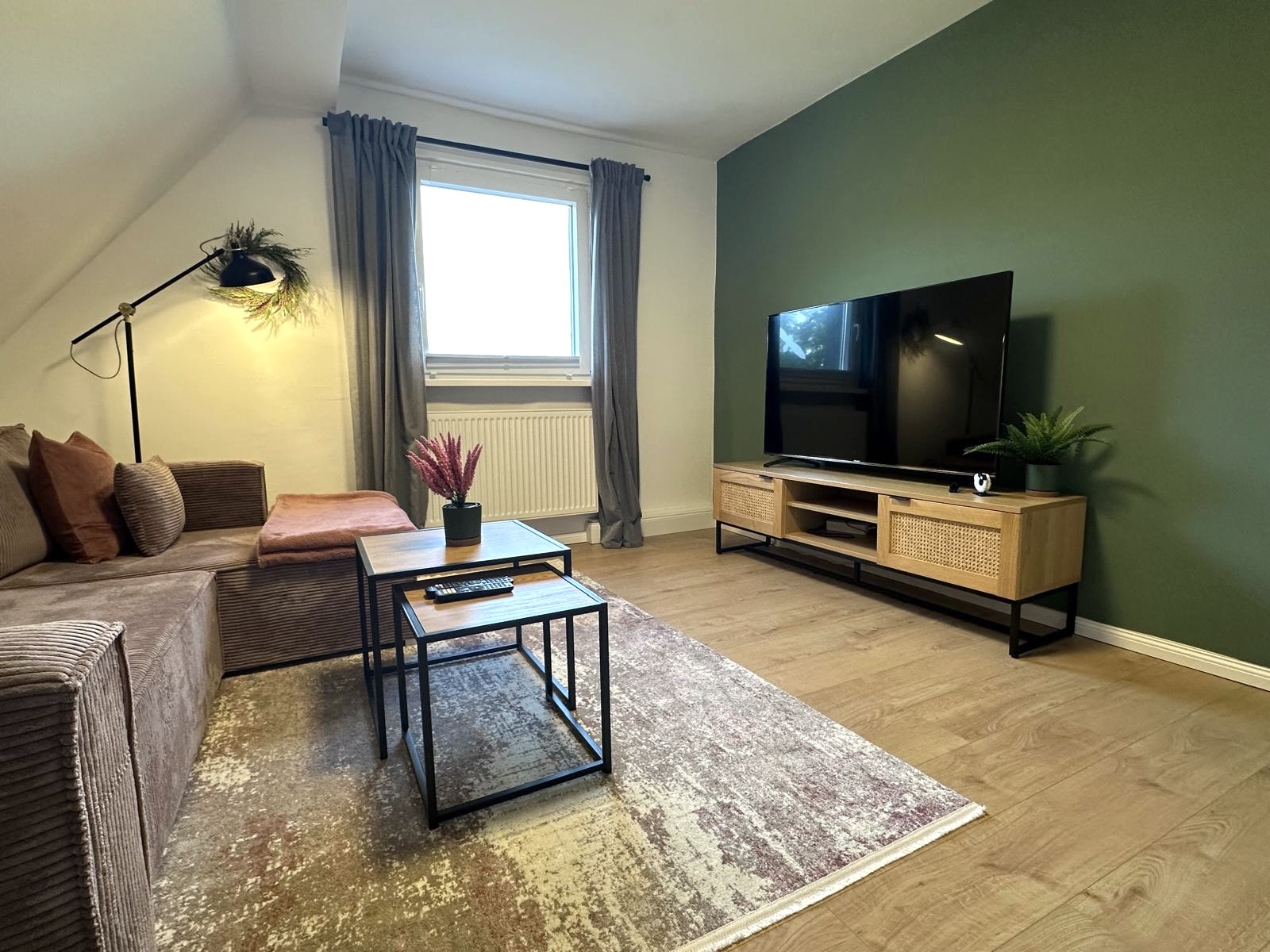 Nach einem langen Tag endlich die Füße hochlegen! Trete ein in das moderne Wohnzimmer, dessen Farben, Grün, Altrosa und Holztöne, an die Natur vor der Haustür erinnern. Nimm Platz auf dem bequemen 3er-Sitzer Sofa im Wohnzimmer, das eine Schlaffunktion hat und wo eine dritte Person einen weiteren Schlafplatz findet. Jetzt einfach den Smart-TV einschalten und den Kopf abschalten! Hier kannst du dich bei deinen Streaminganbietern, wie Netflix oder Amazon Prime, anmelden und das Angebot genauso wie Zuhause nutzen.
